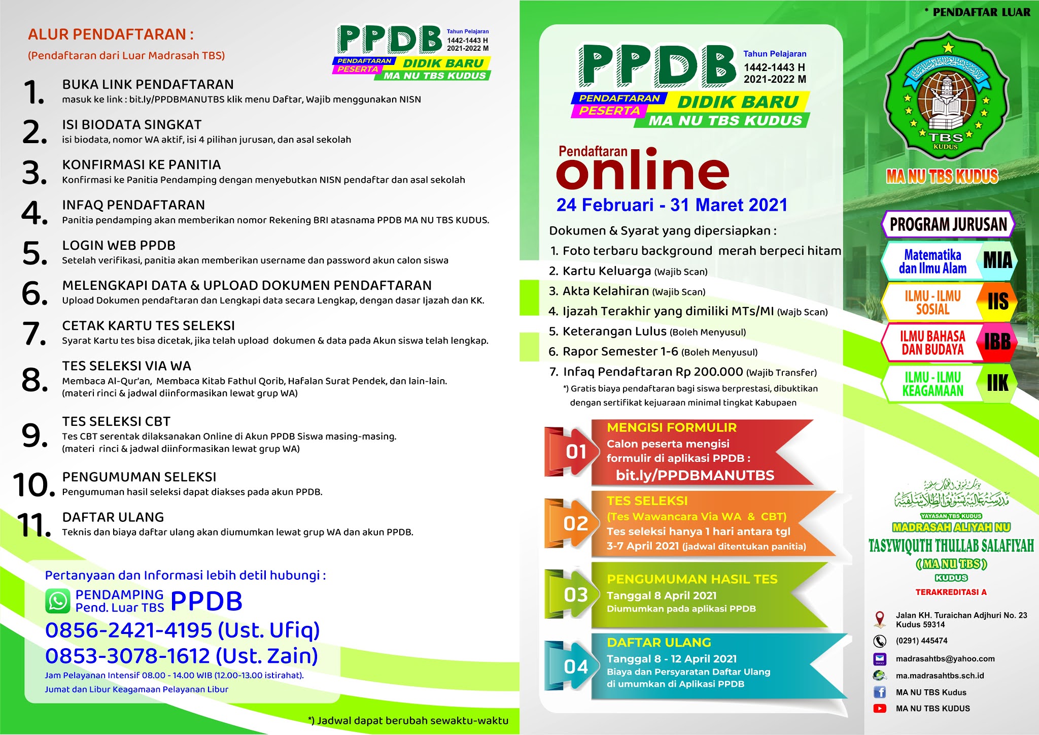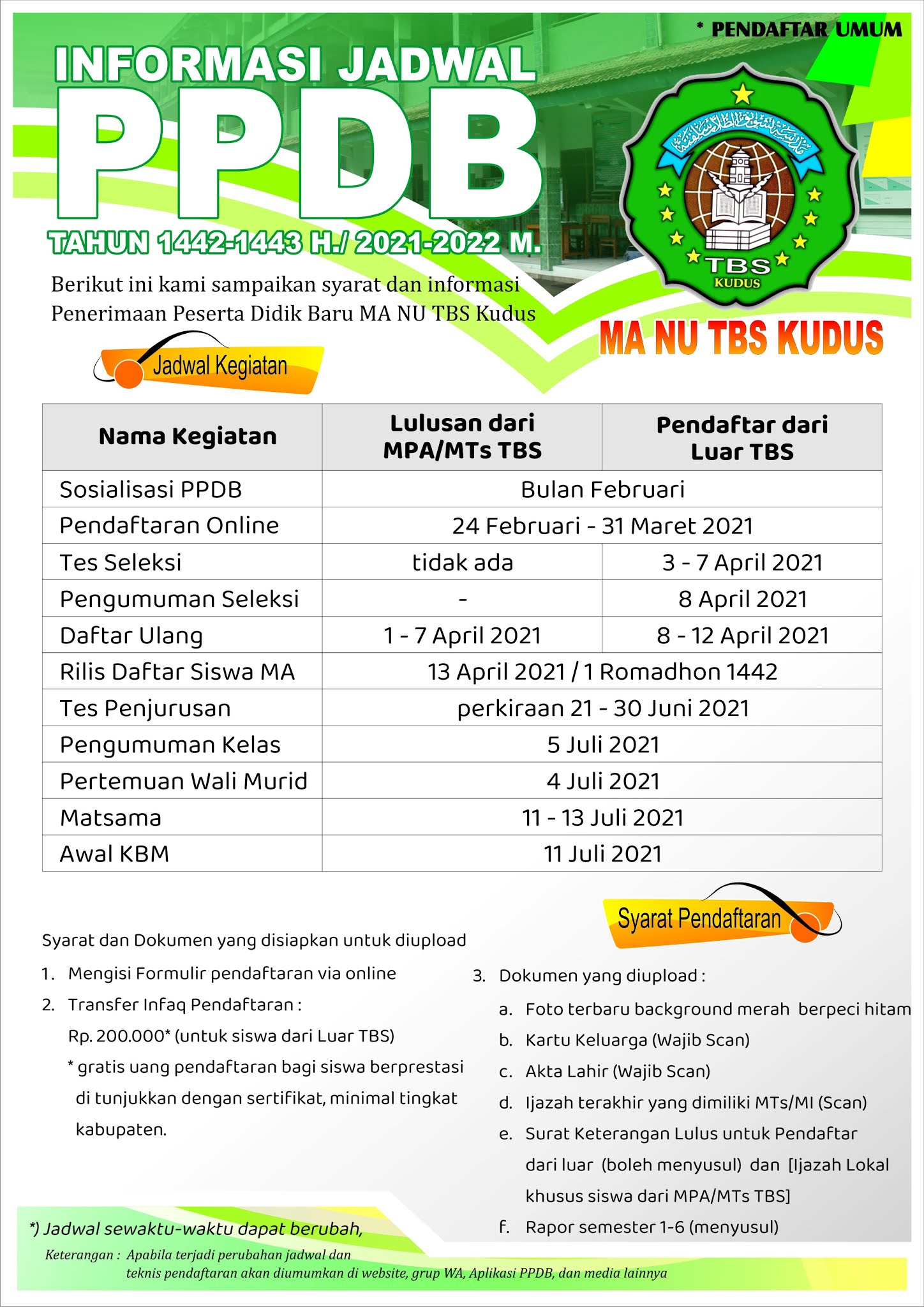MA NU TBS Kudus membuka Pendaftaran Peserta Didik Baru untuk Tahun Ajaran 1442-1443 H / 2021-2022 M. Untuk pendaftaran, silakan klik link berikut: